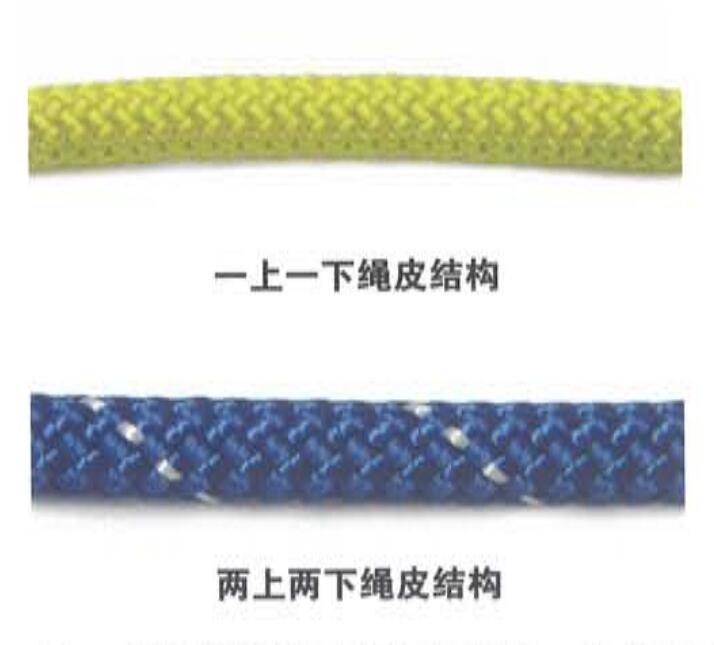 繩皮的設計會對繩索操作、繩皮滑動、耐磨性和繩索的打結有所影響。繩索制造商會根據他們的經驗選擇繩索的股數和編織方式,以便制造出性能最佳的繩索。例如,對于繩皮是48股線的繩索來講,制造商會說其光滑的繩皮具有較好的耐磨性,而對于繩皮是16股線的繩索來講,制造商會說它粗糙的繩皮具有較大的耐磨性。